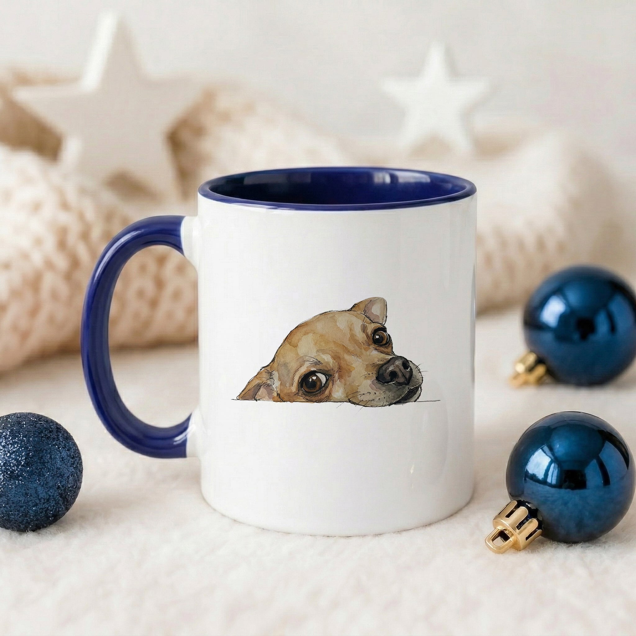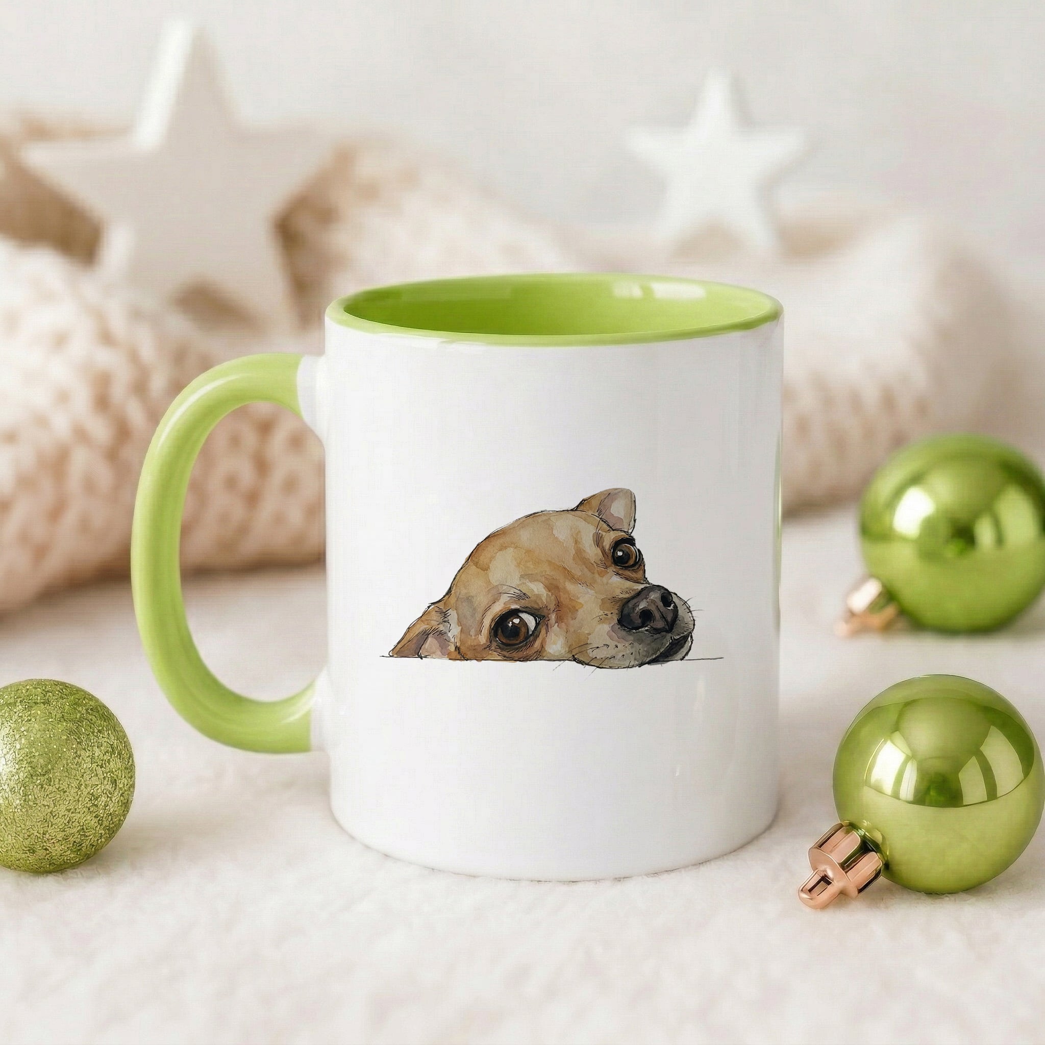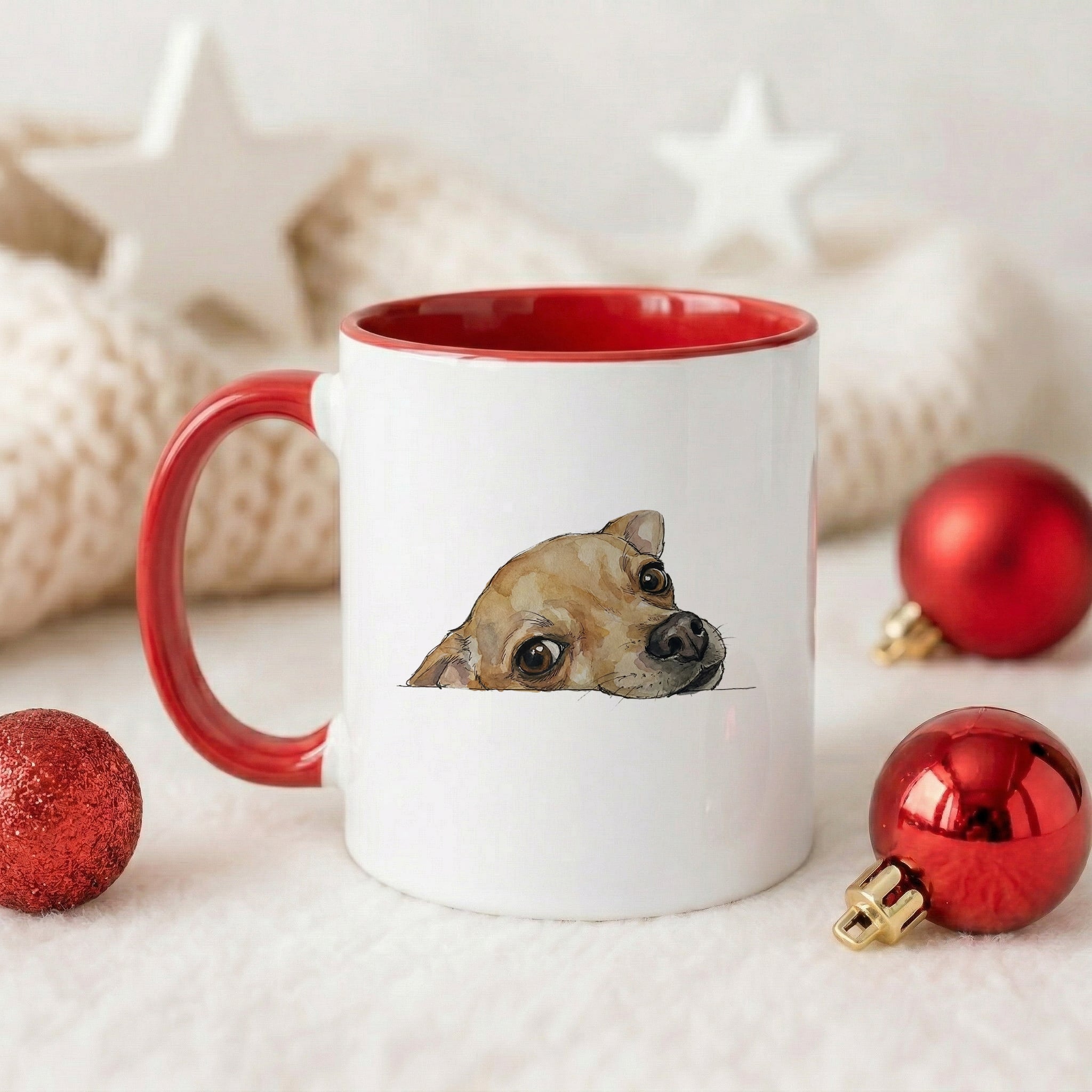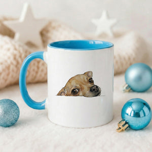 Chihuahua face Accent Mug. Add a splash of color to your daily routine with the sophisticated Accent Mug. The perfect combination of the glossy white ceramic body and the eye-catching contrasting color on the handle and interior creates a unique aesthetic highlight for your work corner or dining table. With a comfortable C-shaped handle design and high-quality, durable materials, this is the ideal companion for your morning coffee or afternoon tea.